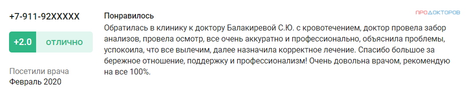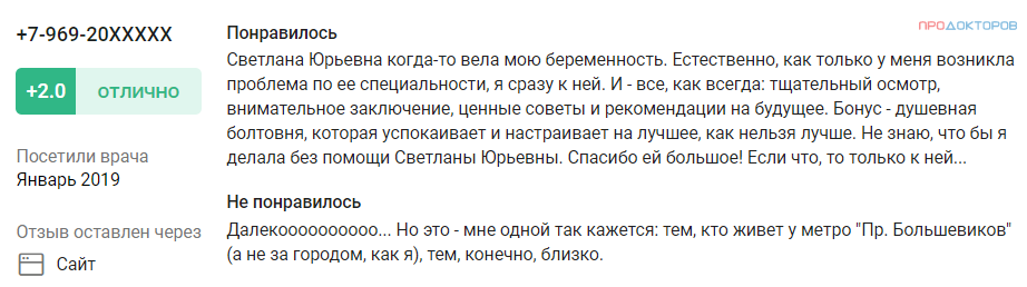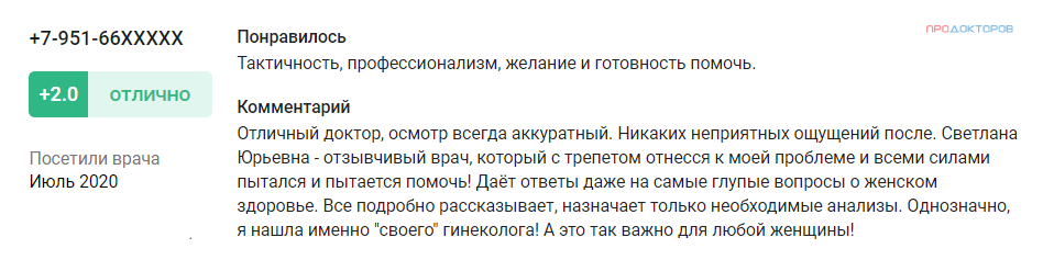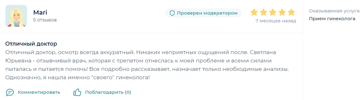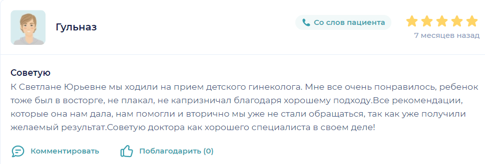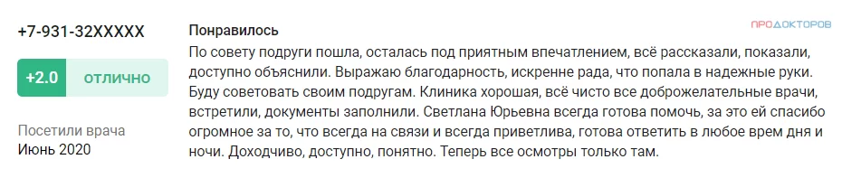 О Светлане Юрьевне отзываются, как о настоящем профессионале своего дела, умеющем не только использовать весь опыт для решения сложных профессиональных задач, но и проявлять внимательность к пациенту, трепетное отношение, глубоко внимать в проблему и понимать "боль" каждого. Большинство пациентов в своих отзывах используют слово "комфорт", что может означать только то, что пациенты чувствуют себя расслабленно, не переживают и чувствуют себя уверенно со Светланой Юрьевной.